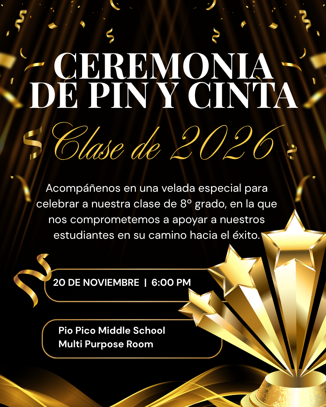 ¡Hola Panteras! Invitamos a nuestros estudiantes de 8.º grado y a sus familias a acompañarnos en una noche dedicada a ustedes. ¡Hablaremos sobre las expectativas, las actividades planeadas para el próximo semestre y mucho más!